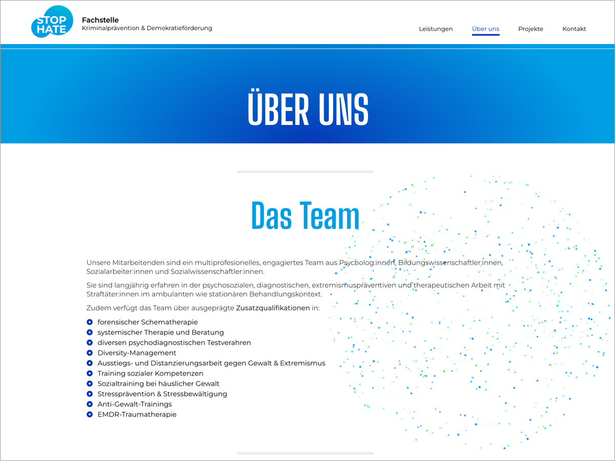 Knifflige Sache: eine Website ohne Fotos zu einem sensiblen Thema: eine forensisch ausgerichtete Fachstelle für Kriminalprävention und Demokratieförderung. Es geht um ein gewaltfreies gesellschaftliches Miteinander – was natürlich vielschichtig ist und wofür viele kleine Schritte nötig sind.